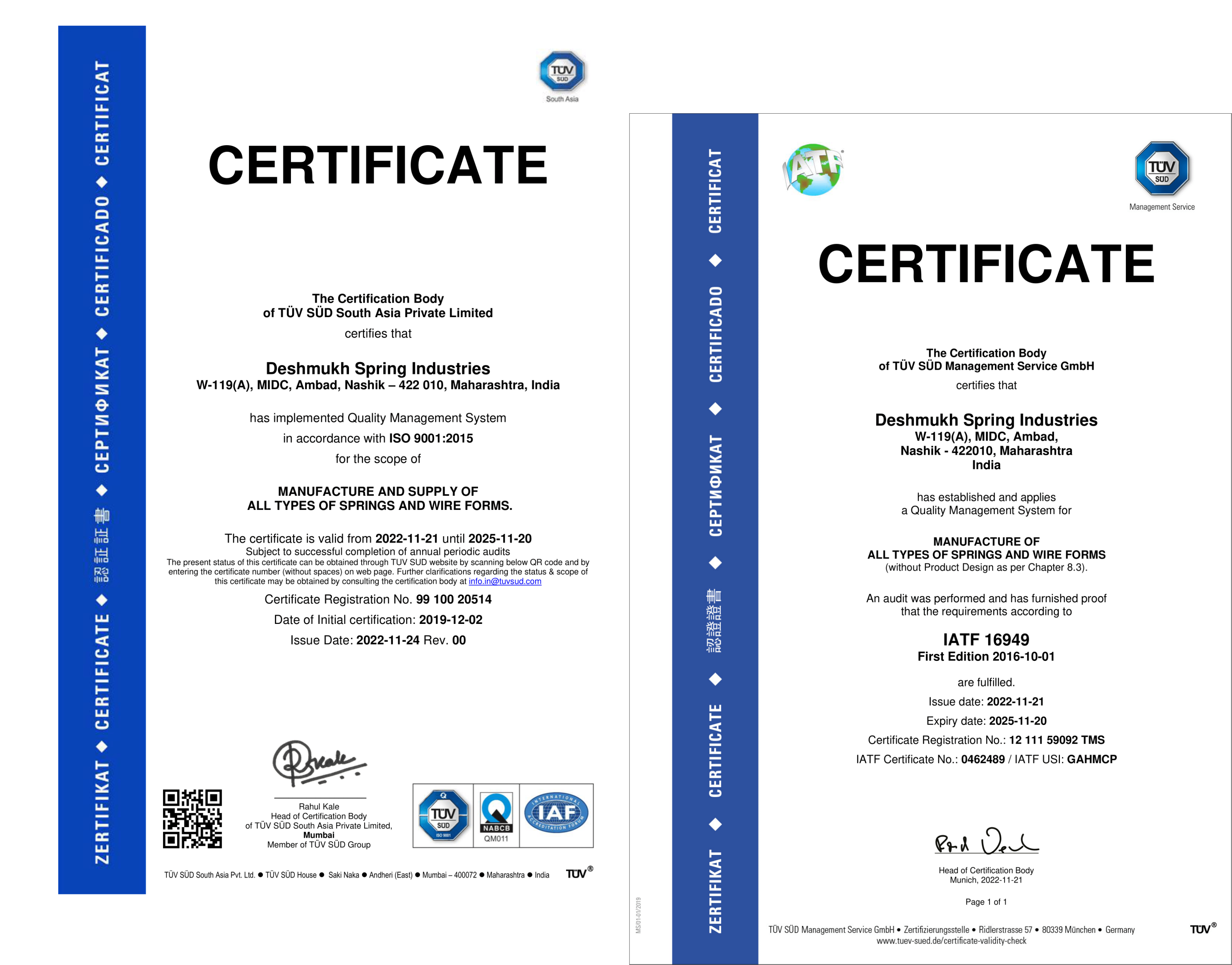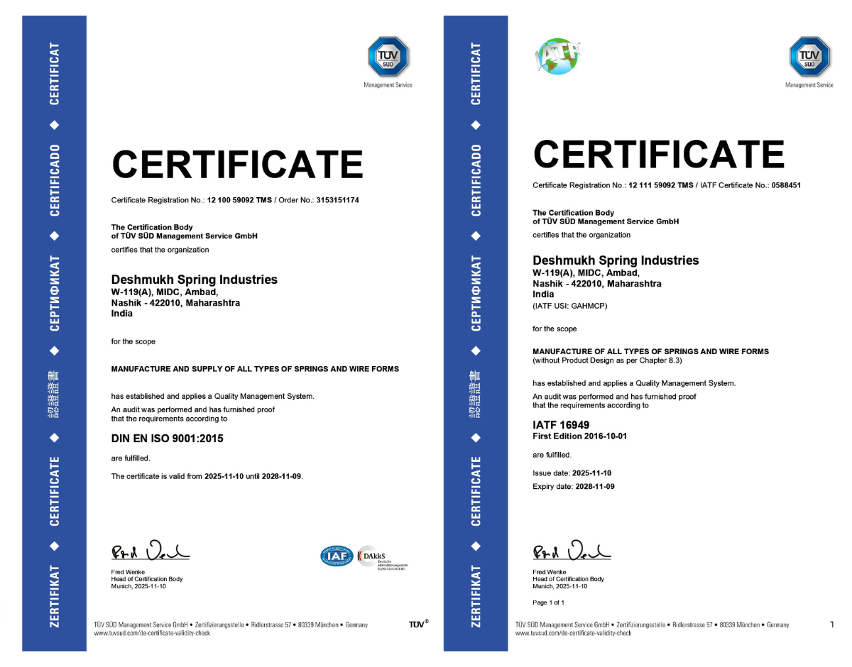 We, All Members of Deshmukh Spring Industries, Ambad, Nashik are commited to manufacture & supply springs to achieve and excel customers satisfaction. We Shall achieve by stressing upon achieving continuous improvement in all area of operation, training, Reducing Manufacturing cost, Customer complaints and maintaining quality systems. The Policy shall be reviewed periodically & revised if needed, to meet the commitment to customer.